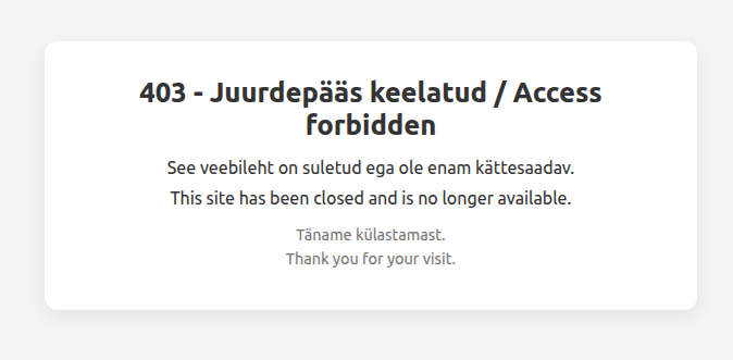 ErrorDocument 403 "<!DOCTYPE html><html lang='et'><head><meta charset='utf-8'><title>403 - Juurdepääs keelatud / Access forbidden</title><style>html,body{height:100%;margin:0;font-family:system-ui,-apple-system,BlinkMacSystemFont,'Segoe UI',sans-serif;background:#f5f5f5;color:#333;}body{display:flex;align-items:center;justify-content:center;text-align:center;} .box{max-width:520px;background:#fff;padding:2rem 2.5rem;border-radius:12px;box-shadow:0 6px 18px rgba(0,0,0,0.08);} h1{font-size:1.6rem;margin:0 0 .75rem;} p{margin:.25rem 0;line-height:1.5;font-size:1rem;} .muted{color:#777;font-size:.9rem;margin-top:.75rem;}</style></head><body><div class='box'><h1>403 - Juurdepääs keelatud / Access forbidden</h1><p>See veebileht on suletud ega ole enam kättesaadav.</p><p>This site has been closed and is no longer available.</p><p class='muted'>Täname külastamast.<br>Thank you for your visit.</p></div></body></html>"